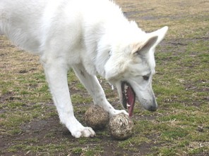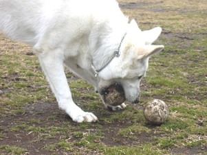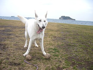 | 2コのボールを独り占めしたいけど 一度にくわえられなくて困ったな |