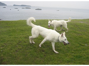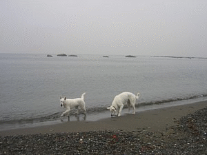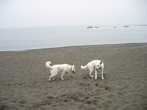 | あいにくの雨です でもダンテ&吹雪は雨なんて関係ないの 海で大はしゃぎ いっぱいかけっこしました 家の中ではダンテ君の方が強かったのに 海では吹雪が強い 縄張りだと思ってるのかな さあ どっちがどっち もうわかりませ〜ん |
