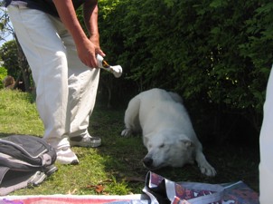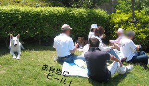 | みんなビールで乾杯 ワンコ達は日陰でひと休み ハーシーは人が通るたびに ワンワン こわいラジャ母さんとS母さんにポカポカやられて 木陰に隠れてシュンとしてます 一番おとなしくてお利口さんはビノちゃんでした 年の功 ですよね |